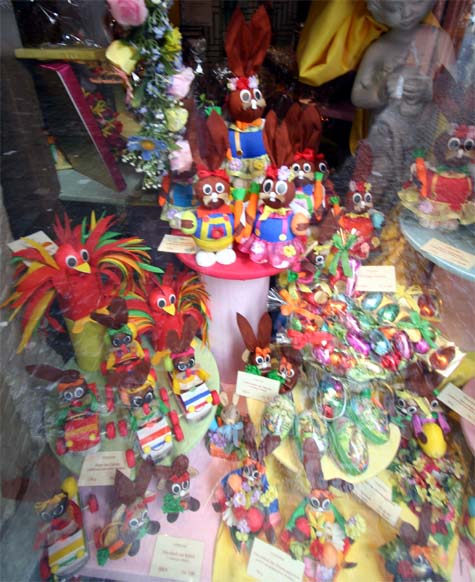 Everywhere you look the windows are decorated for Easter. They have some really cool Easter Decorations. I like the rabbits ;) There are also HUGE chocolate bunny rabbits sold in the candy stores. I should say that there are candy stores and book stores all over the place. I can only assume that they like to read here and they like to eat chocolate! :)